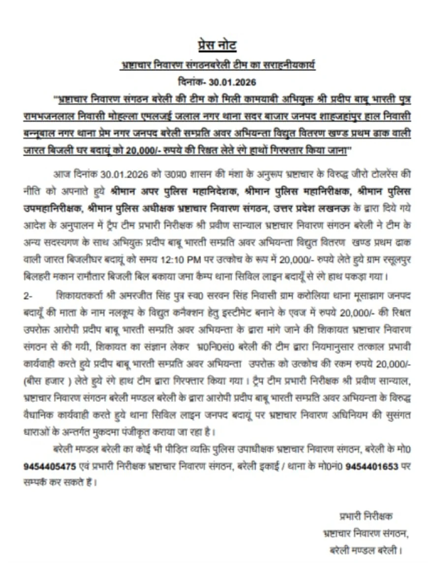 Budaun (RNI) The Anti-Corruption Team from Bareilly on Friday arrested a junior engineer of the power department while accepting a ₹20,000 bribe from a farmer in Budaun district. The engineer allegedly demanded the amount in exchange for providing an electricity connection for a tubewell.